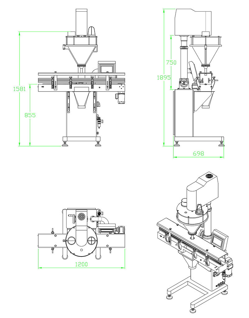 氣動托罐裝置,保證充填時物料不灑出容器外。