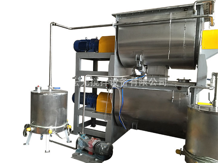 6、加液霧化裝置:對不同粘稠度的液體物料進(jìn)行霧化,使加入液體物料混合均勻(噴灑狀)。